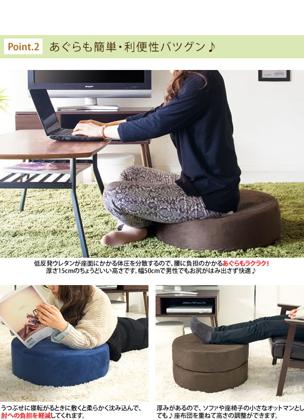 分厚く存在感のある座布団は、低反発ウレタンを使用した15cmの極厚クッション。腰をしっかりと支えてくれて、へたりにくく、長くお使いいただけます。