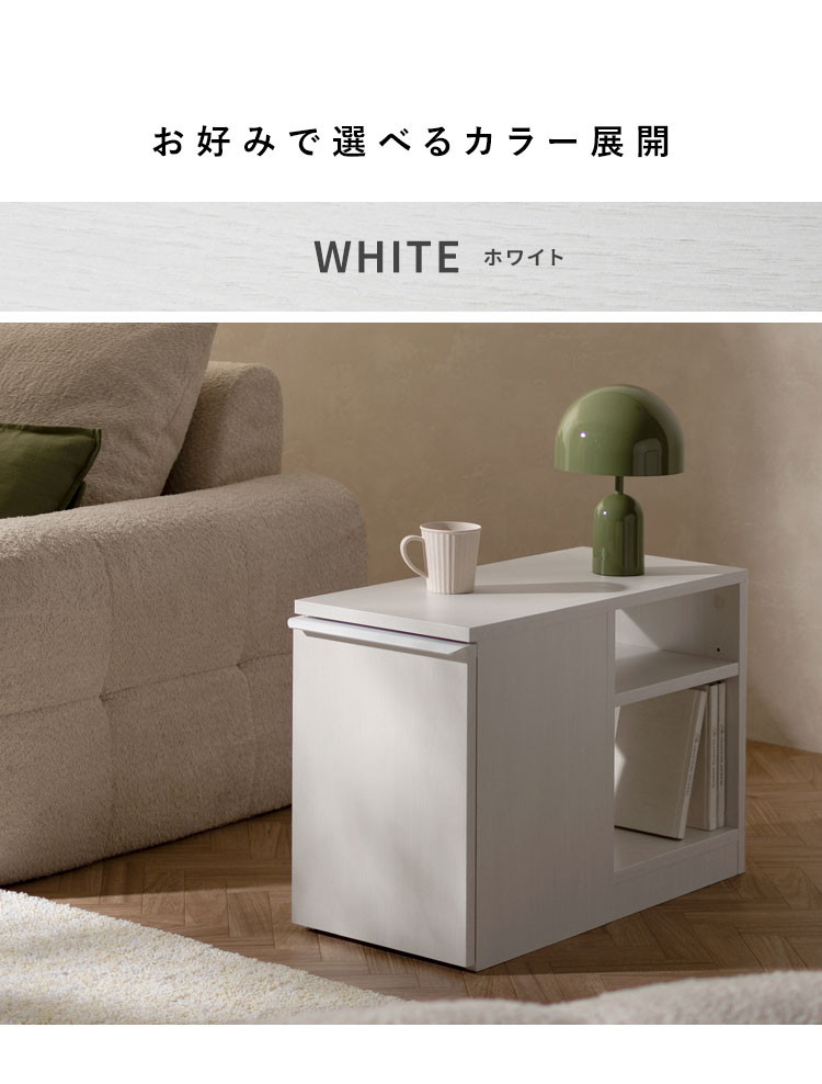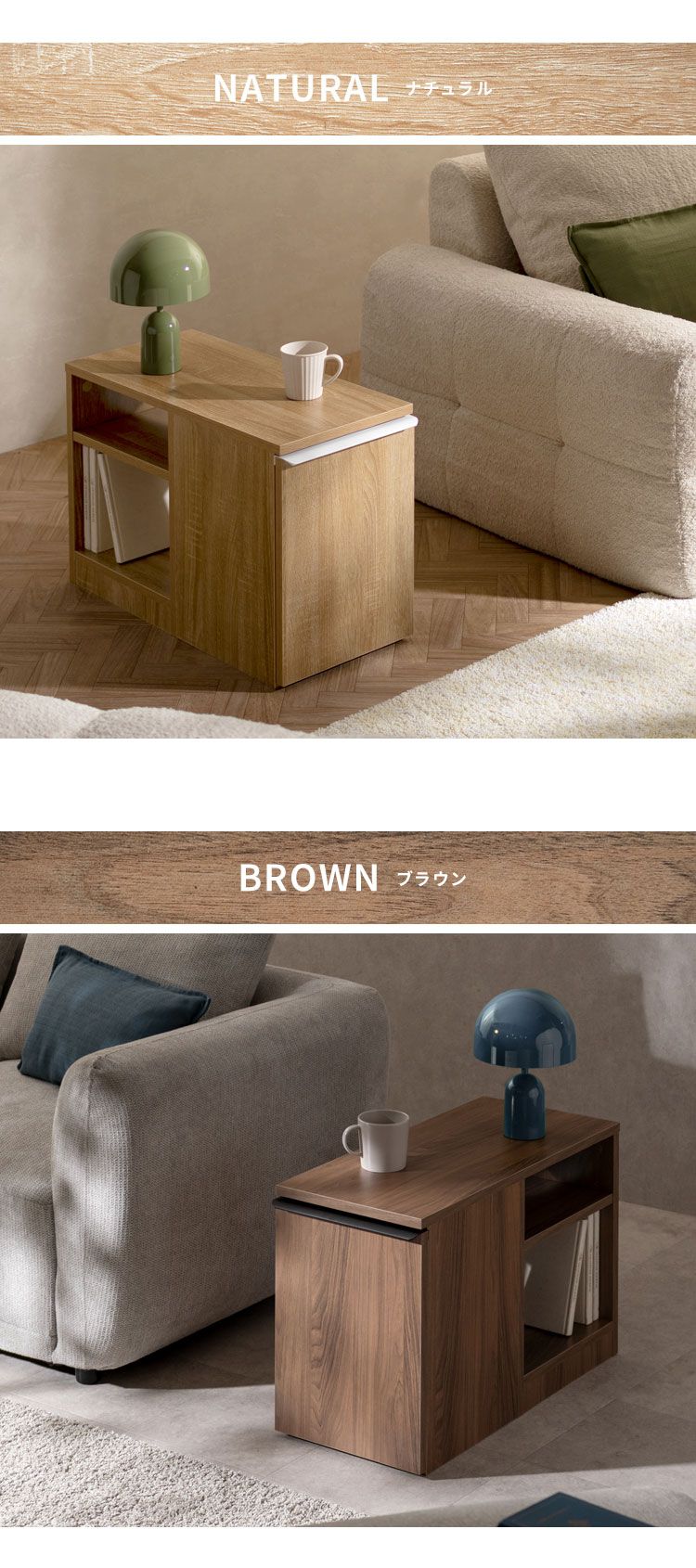 ソファの横でマグカップやリモコンを置ける天板、本や雑貨を収納できる収納棚、リビングで出たゴミをサッと捨てられるゴミ箱が一つになった便利なアイテムです。