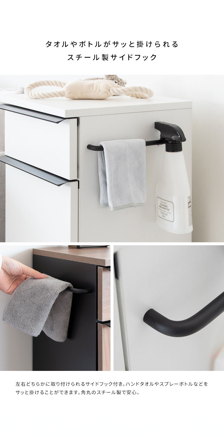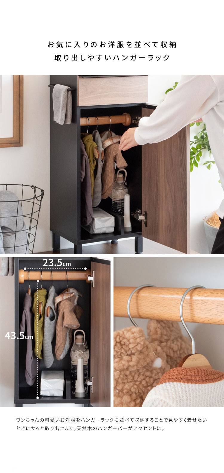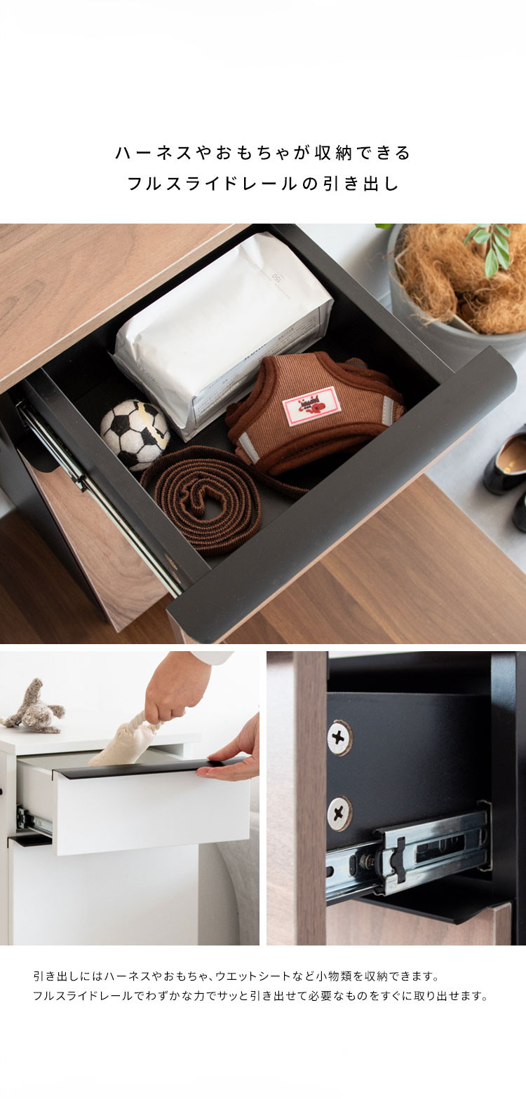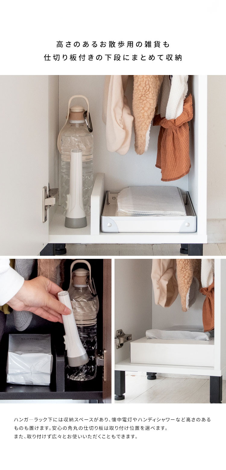 引き出しやハンガーバー、下棚、天板、サイドフックなどに必要なものがまとめて収納できるので、お散歩準備もスムーズ。