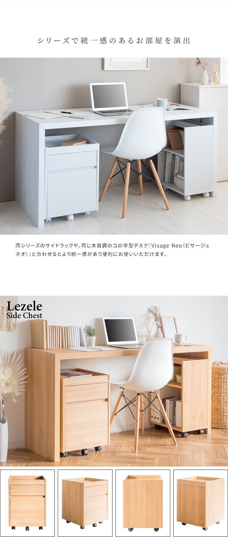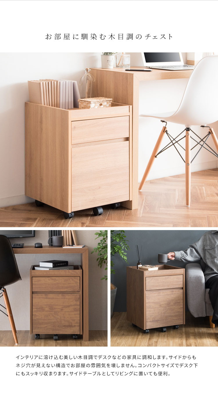 色々収納できる引き出しが二杯付いたシンプルで美しい木目調のサイドチェスト「Lezele(ルゼル)」。デスク周りはもちろんリビングや寝室などお家の色々な場所でマルチに活躍します。