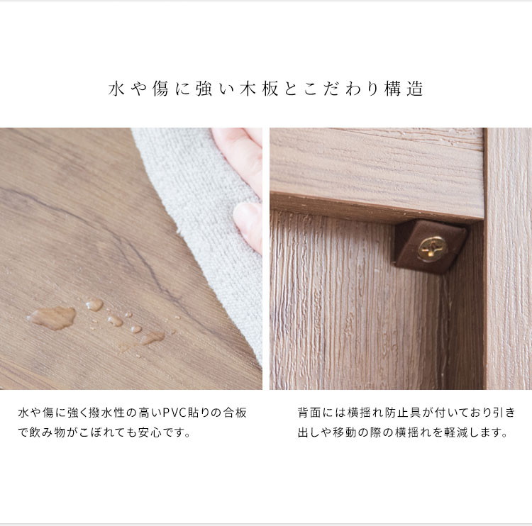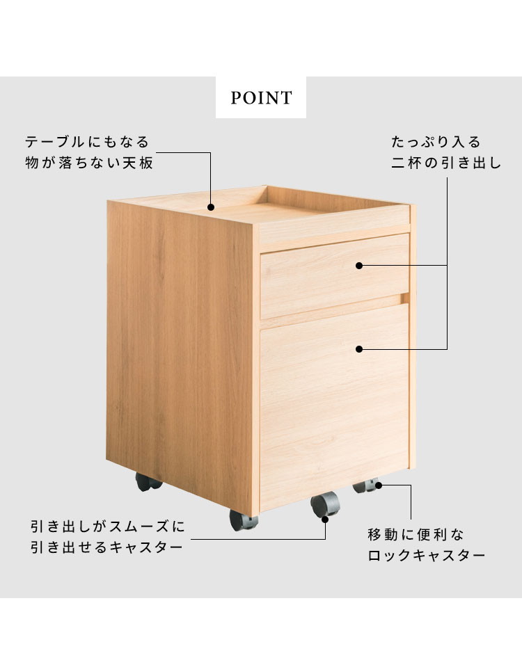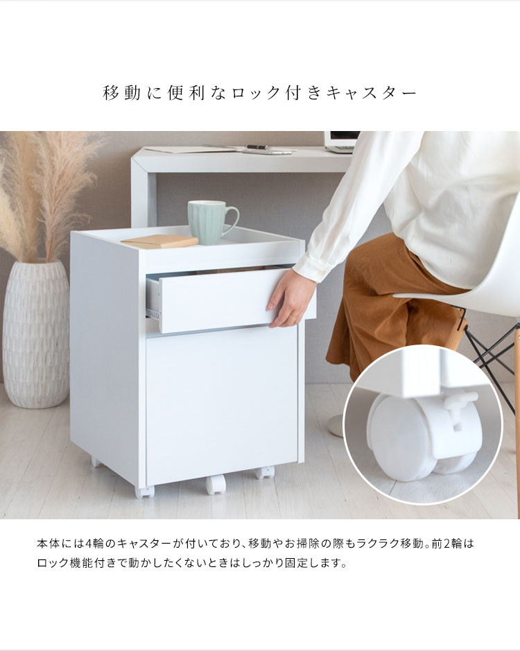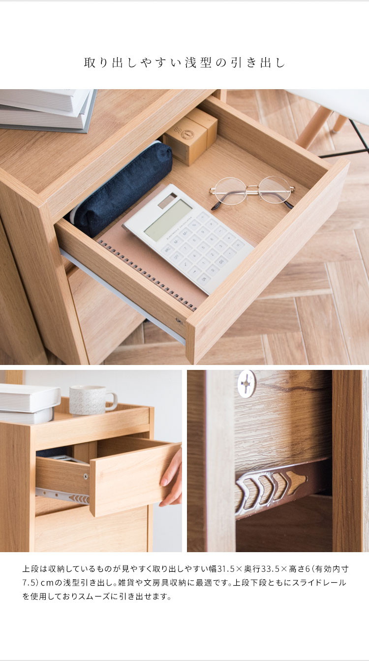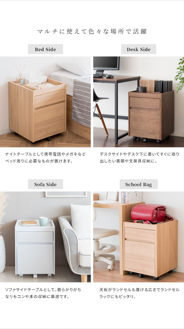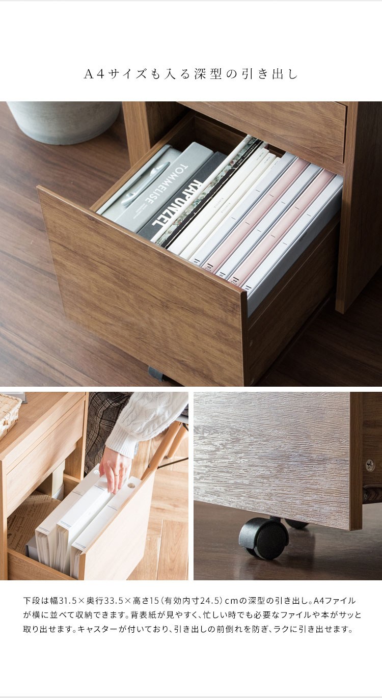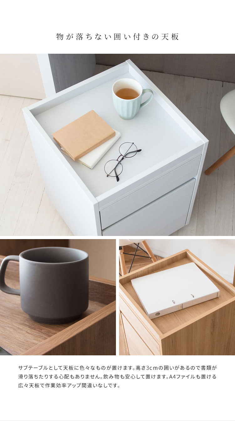 深さの異なる二つの引き出しはA4ファイルも収納できるサイズ。天板は囲いがあり書類やマグカップの落下を防げます。キャスター付きで移動もラクラク。