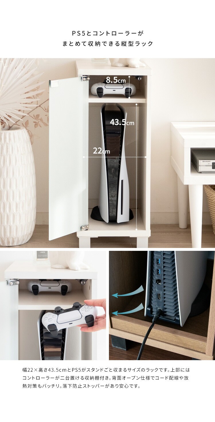 PS5など据置ゲーム機が縦にピッタリ収まるラックはガラス扉になっており、ゲーム機を隠してホコリの侵入を防ぎます。