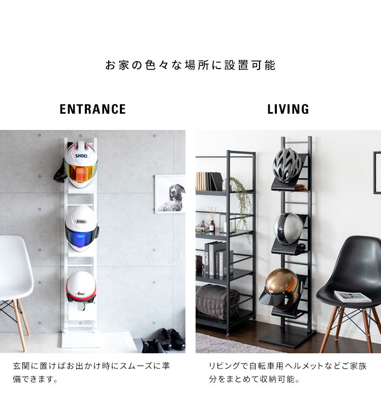 ホワイトとブラックの2カラーをご用意。お好みやお部屋の雰囲気でお選びください。バイカーはもちろん、努力義務となった自転車のヘルメット収納にもぴったり。ご家族でお使いいただけます。