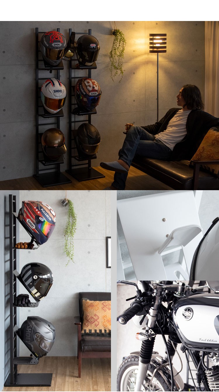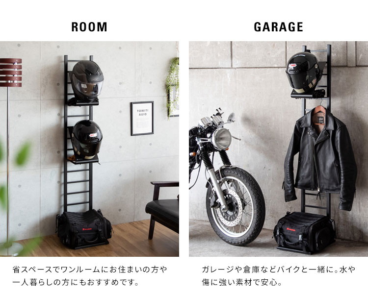 スタンドはグローブなどを置ける収納棚やジャケットを掛けられる仕様でお出かけ時に必要なものをまとめて収納できます。別売りのヘルメットフックを使用すれば最大3個収納可能。