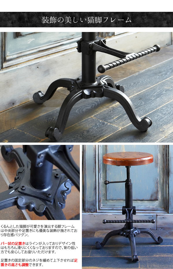 くるんと丸い猫脚フレームや装飾の施された足置きが特徴的なバーチェアは重厚な雰囲気の中に美しさや可愛さが感じられるデザイン。
