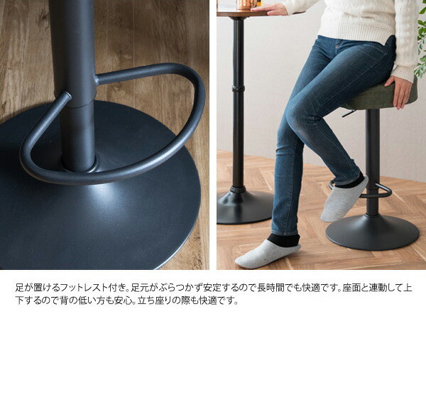 360度どこからでも座れるラウンドデザイン、クッション性に優れた座り心地、簡単昇降機能とフットレスト付きで機能性・デザイン性に優れております。バーテーブルやカウンターに合わせてゆったりお座りいただけます。