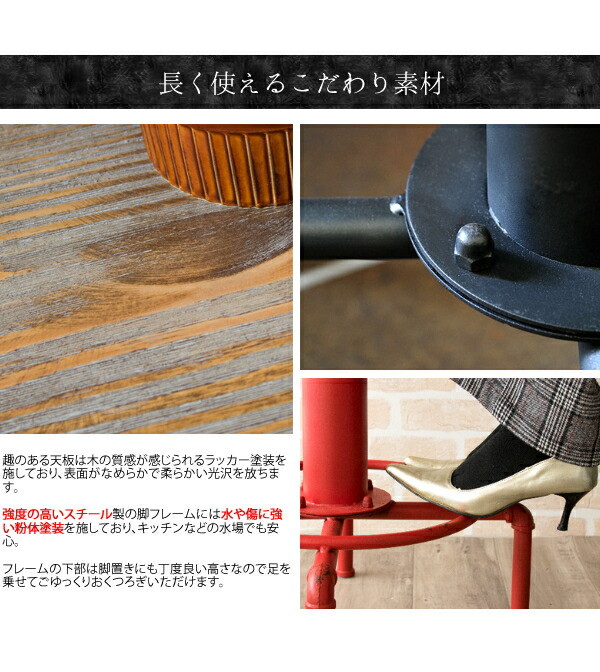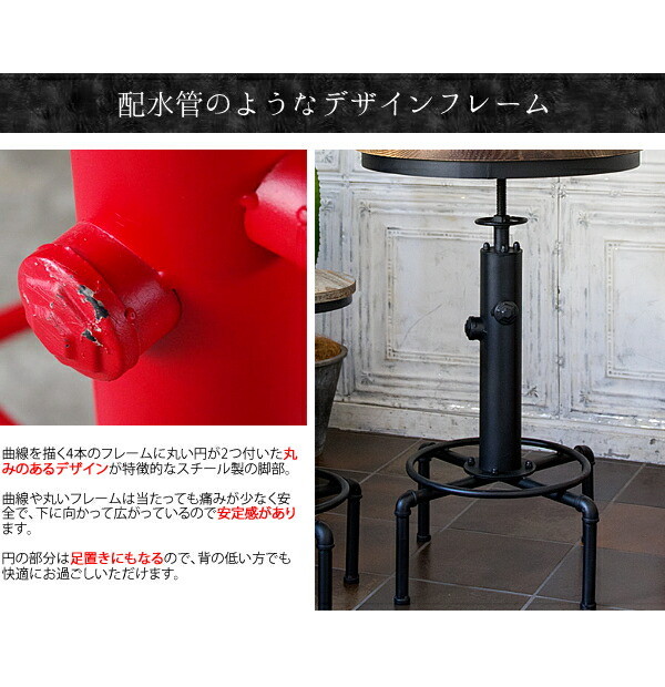 ヴィンテージ加工された広々丸い天板と、配水管のような特徴的なデザインが目を引く脚フレームはインテリア性もバツグン。高さを83~100cmで昇降できるので使う人やチェアの高さに合わせて簡単に調節可能です。