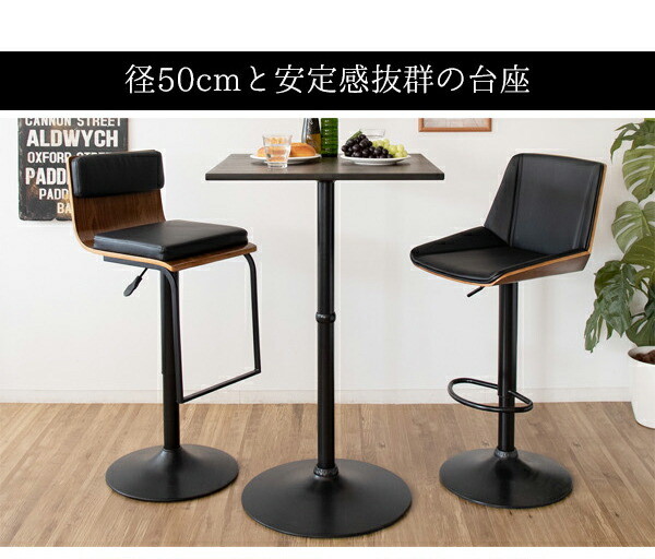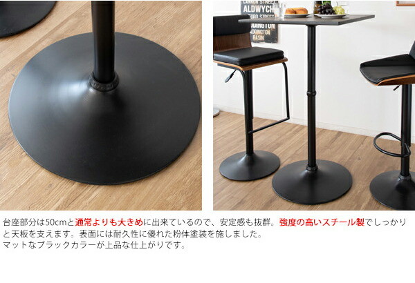 台座は通常よりも大きめな径50cmと安定感抜群。マットなブラックのスチール脚が、瓶やグラスをたくさん置いた天板でもしっかりと支えます。