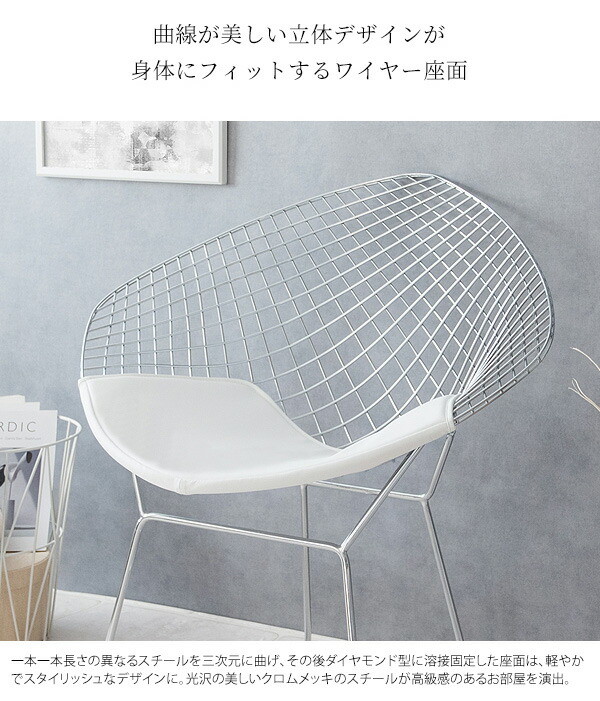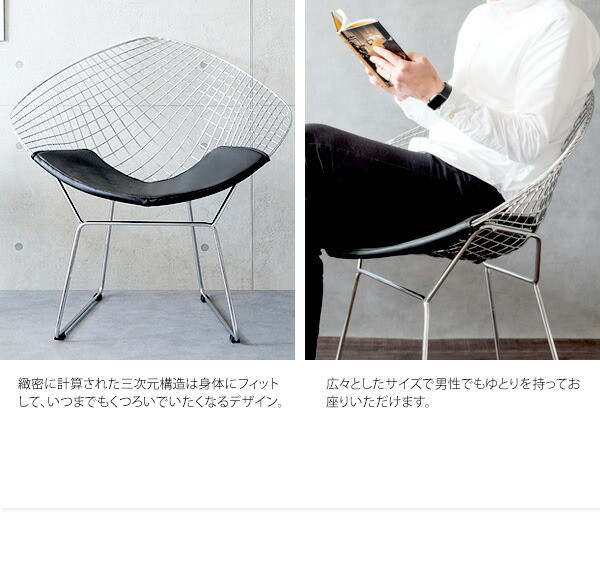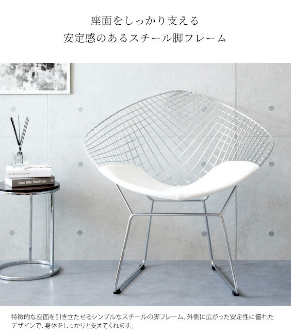 ミッドセンチュリーモダンを代表するデザイナー、ハリー・ベルトイアが20世紀の新しい家具を象徴するデザインとして大ヒットさせ、今もなお愛され続けている「ダイヤモンドチェア」のリプロダクト品です。