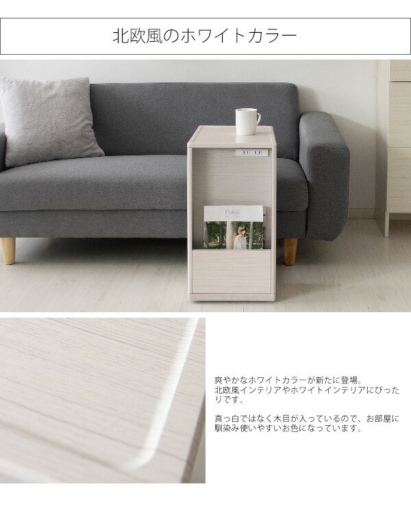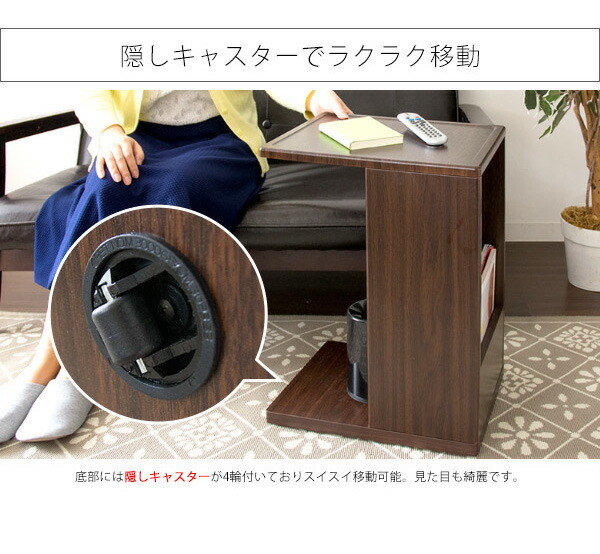 コの字型のデザインでソファ・ベッドに引き寄せてお使いいただけます。正面には雑誌や新聞が立てられるラック、背面は本や雑貨、表に見せたくないゴミ箱やルーターなどを置けます。
