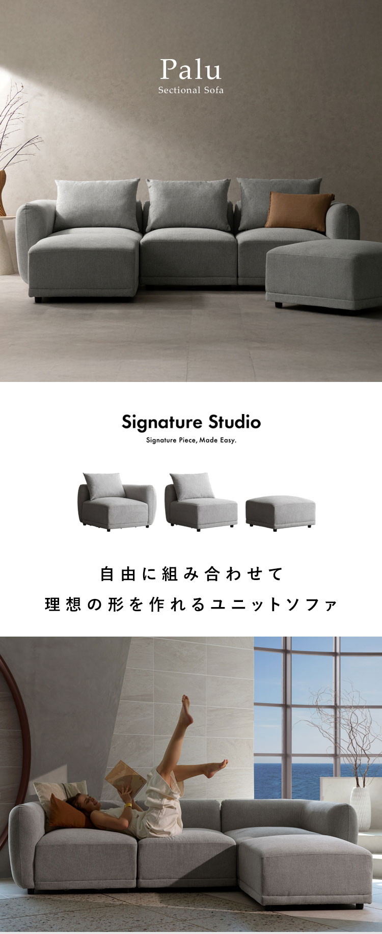 三種類のソファを組み合わせてお好みの形にできるユニットソファ『Palu(パル)』。肘掛けのあるコーナーソファ、中央に置けるアームレスソファ、オットマンから置く場所や座る人数に合わせて様々なパターンができます。