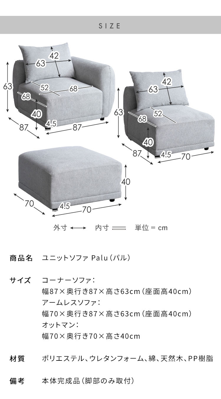 サイズ コーナーソファ:約幅87×奥行き87×高さ63cm