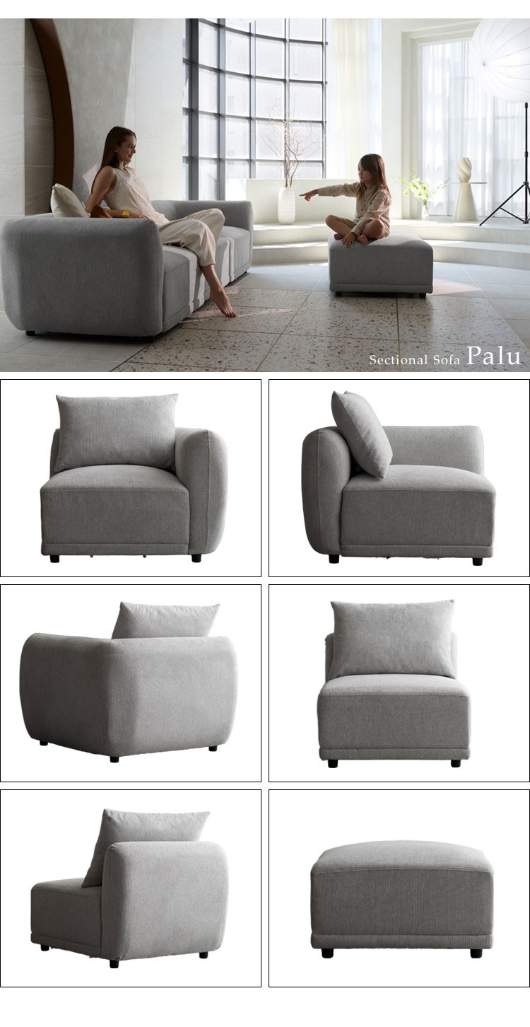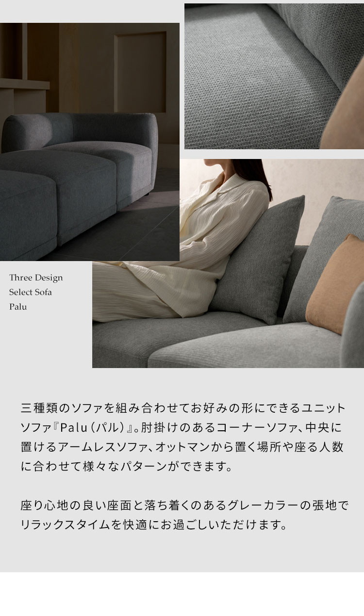 三種類のソファを組み合わせてお好みの形にできるユニットソファ『Palu(パル)』。肘掛けのあるコーナーソファ、中央に置けるアームレスソファ、オットマンから置く場所や座る人数に合わせて様々なパターンができます。