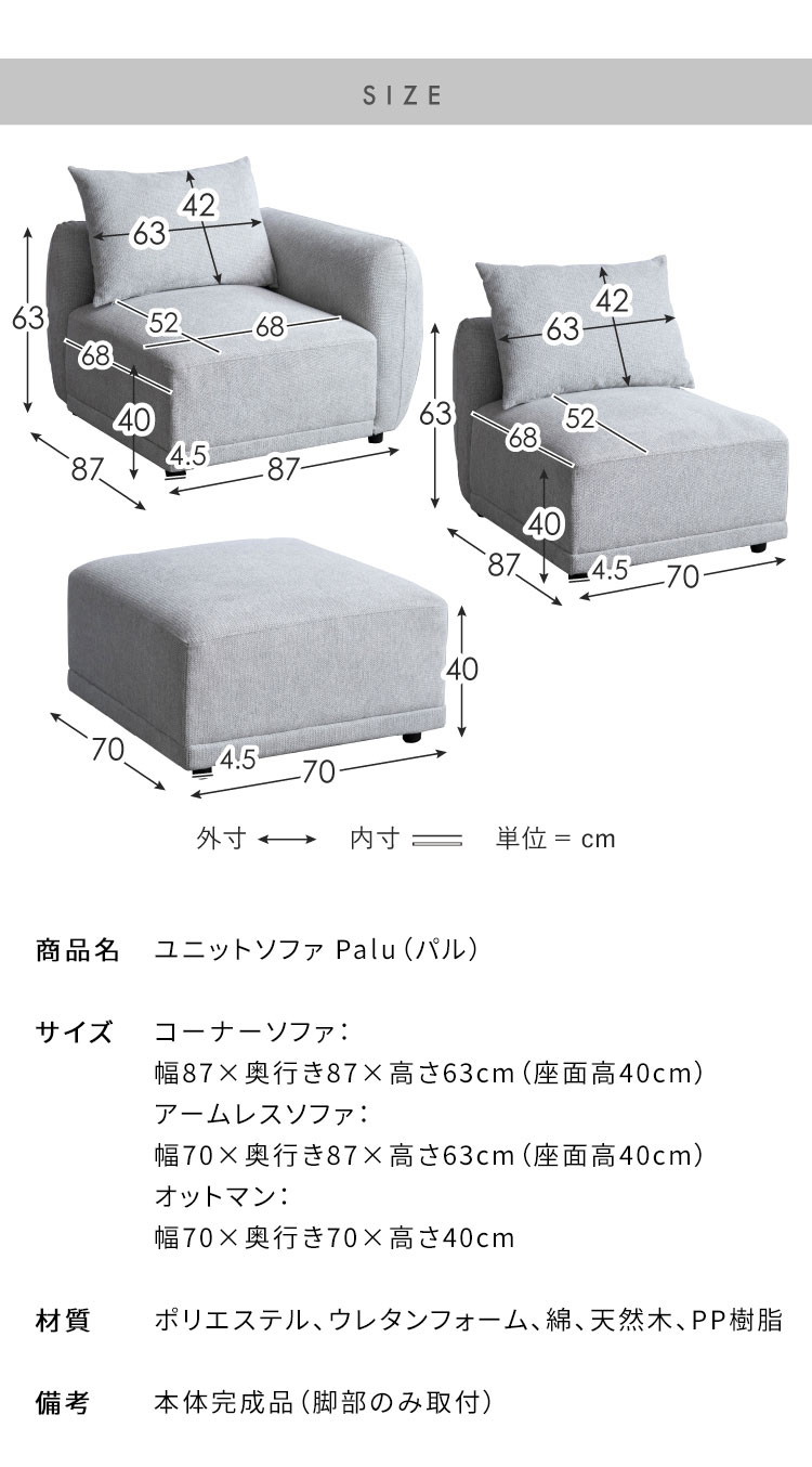 サイズ コーナーソファ:約幅87×奥行き87×高さ63cm