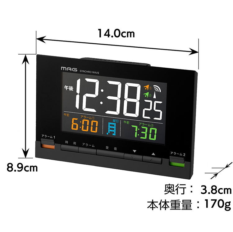 MAG 目覚まし時計 置き時計 電波時計 デジタル AC電源 カラー液晶 光る 見やすい 温度計 カレンダー 電子音