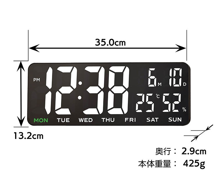 機能:置掛兼用、時刻表示、カレンダー表示、温度/湿度表示、12/24時間表示切替、夜間2段階自動減光機能