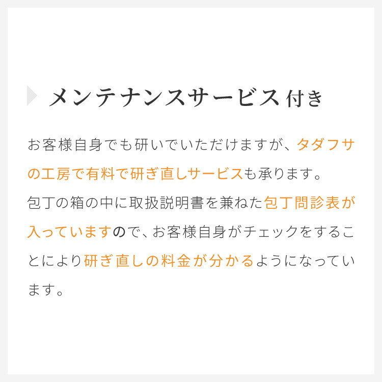 お客様自身でも研いでいただけますが、タダフサの工房で有料で研ぎ直しのサービスも承ります。庖丁の箱の中に取扱説明書を兼ねた「庖丁問診表」が入っていますので、お客様自身がチェックをする事により研ぎ直しの料金が分かるようになっています。