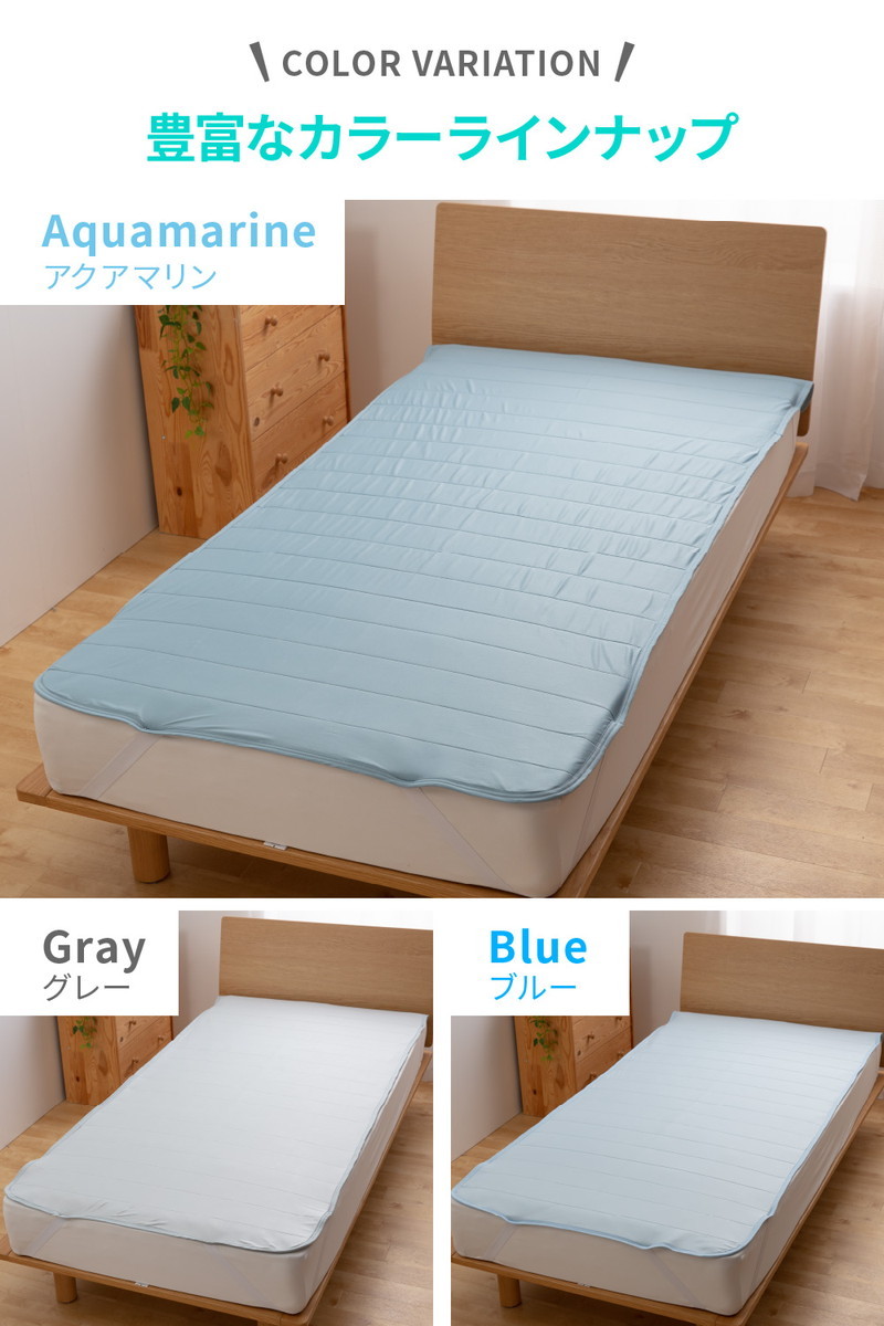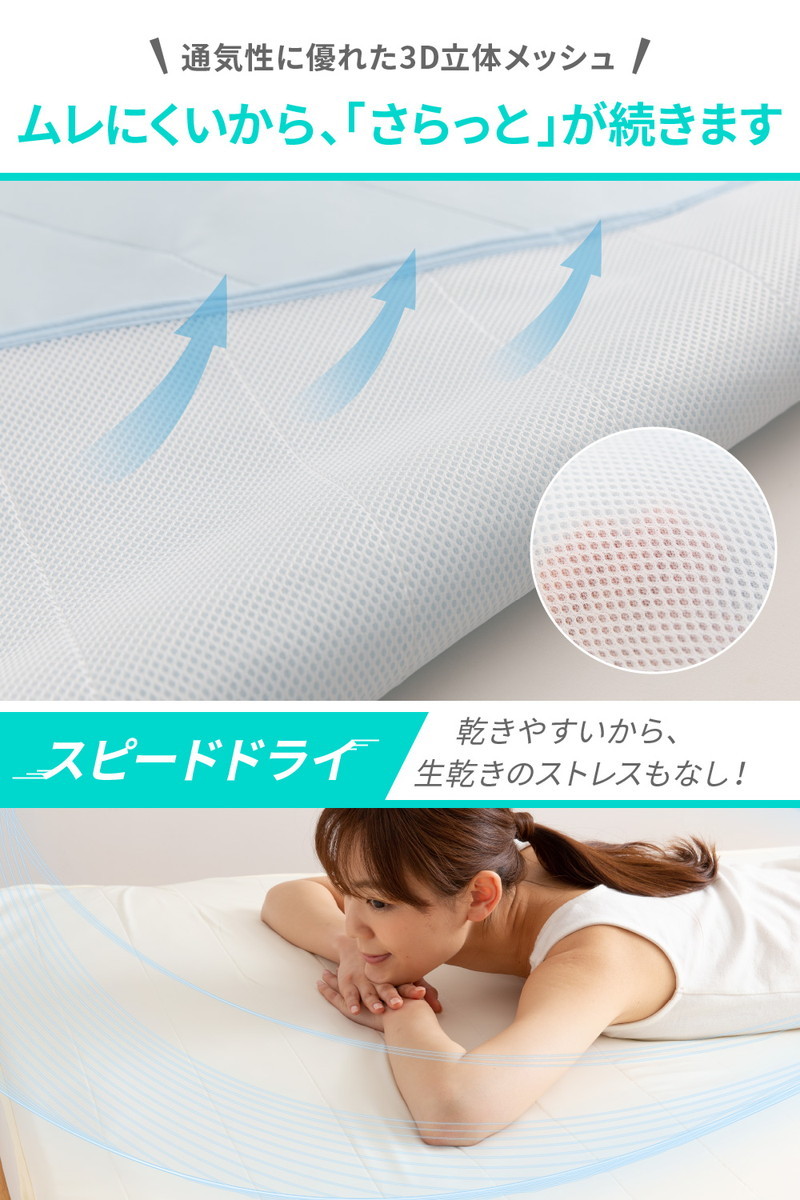 ■【特長】触れるとひんやり冷たい感触で、ほてった体に気持ちいい敷きパッドです。裏面の3Dメッシュ仕様で通気性にも優れているため、熱がこもりにくく、ひんやり寝具にありがちなムレを軽減。 ・【特長】世界最高水準の安全な繊維製品の証として知られる「エコテックススタンダード100」を取得、小さなお子様にも安心してご利用いただけます。・【特長】四隅ゴムバンド付きで敷きパッドをしっかり固定できます。ベッドマットレスや敷布団にもお使いいただけます。