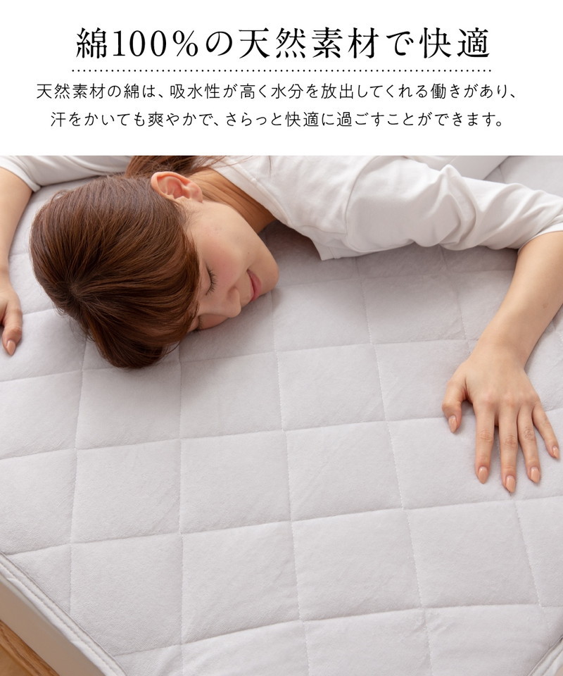 綿100%のタオル地にシャーリング加工を施し、ふんわりさらさらの肌触りが心地いい敷きパッド。抗菌防臭わた使用でニオイのもとになる菌の繁殖を抑制。