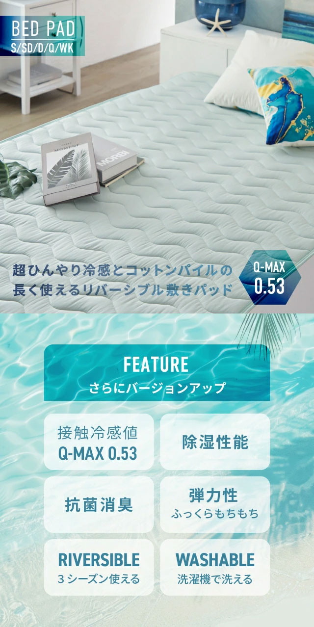 敷パッド 接触冷感 シングル セミダブル ダブル リバーシブル敷きパッド 超ひんやり冷感 コットンパイル 長く使える ミントグリーン シングル