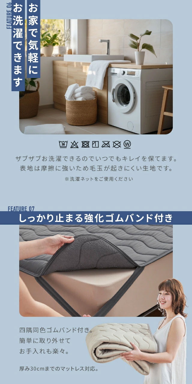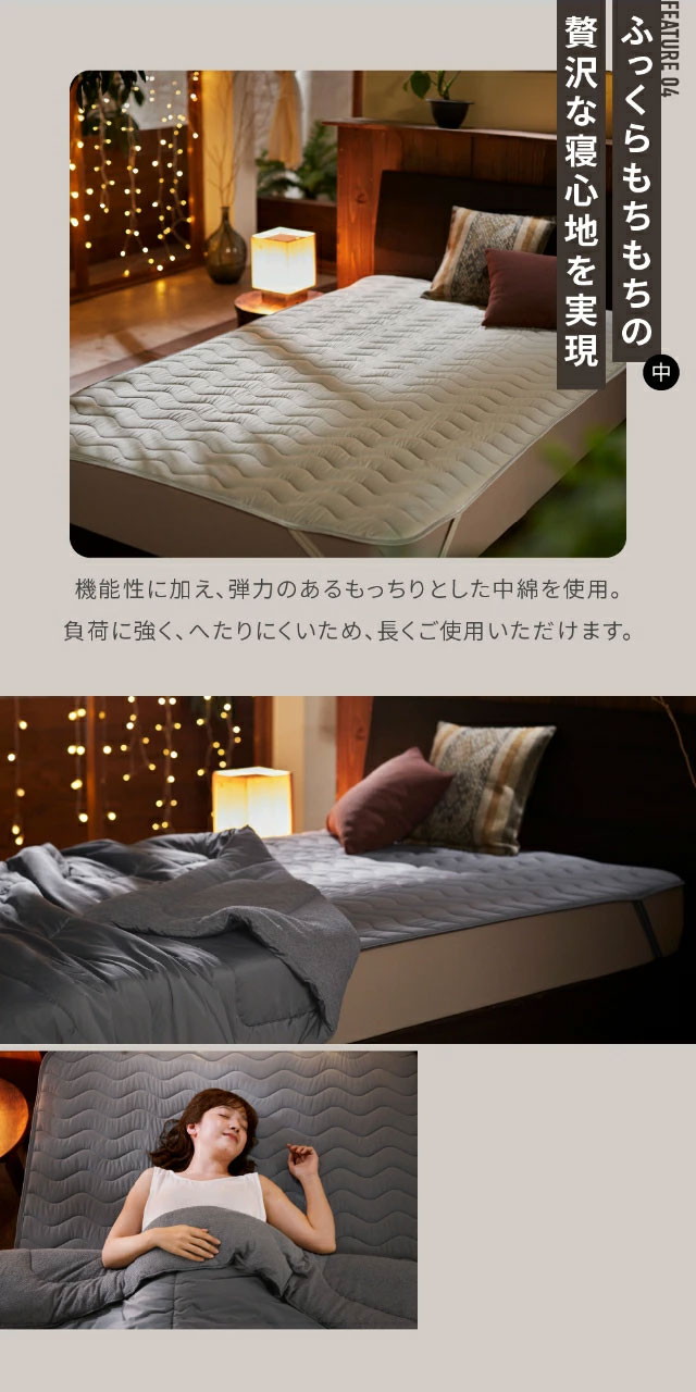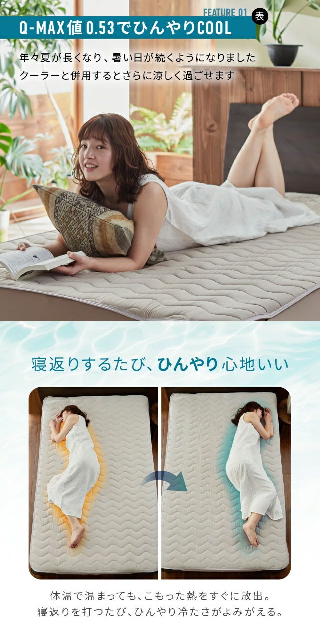 接触冷感生地を使用し、暑い季節はもちろん3シーズン快適な眠りをサポートする、機能性抜群の敷きパッドです。