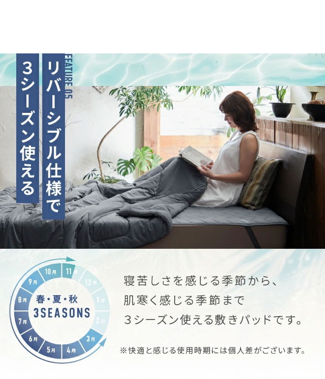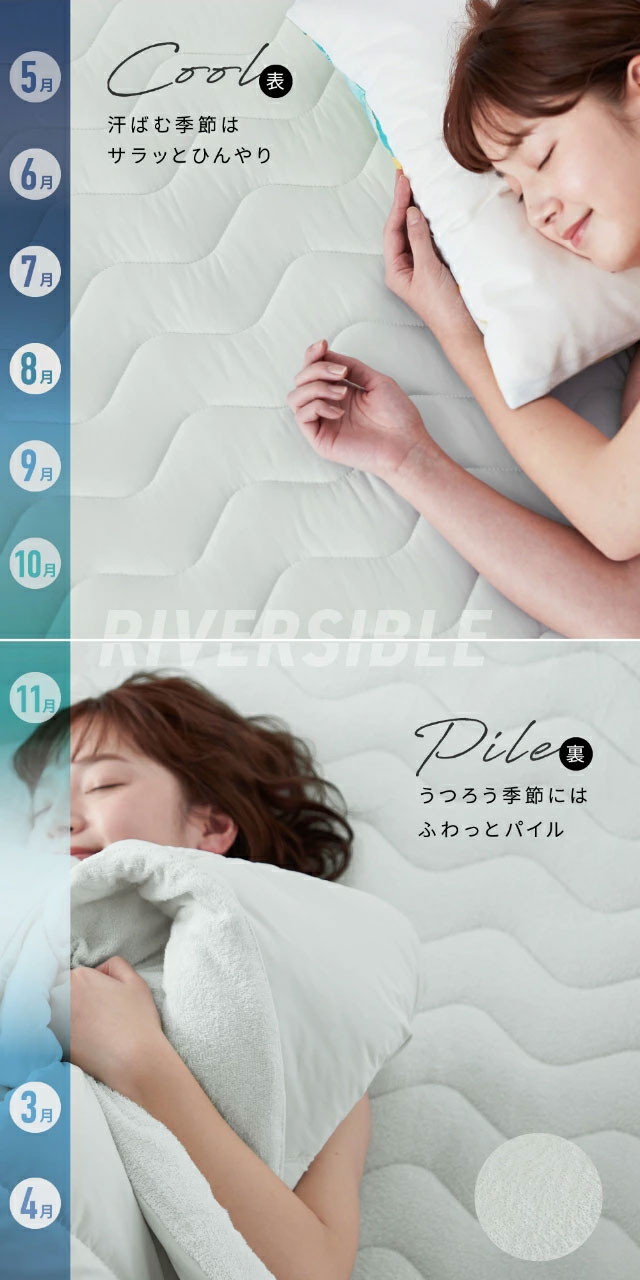 寝苦しさを感じる季節から、肌寒く感じる季節まで、リバーシブル仕様で、3シーズン使える敷きパッドです。