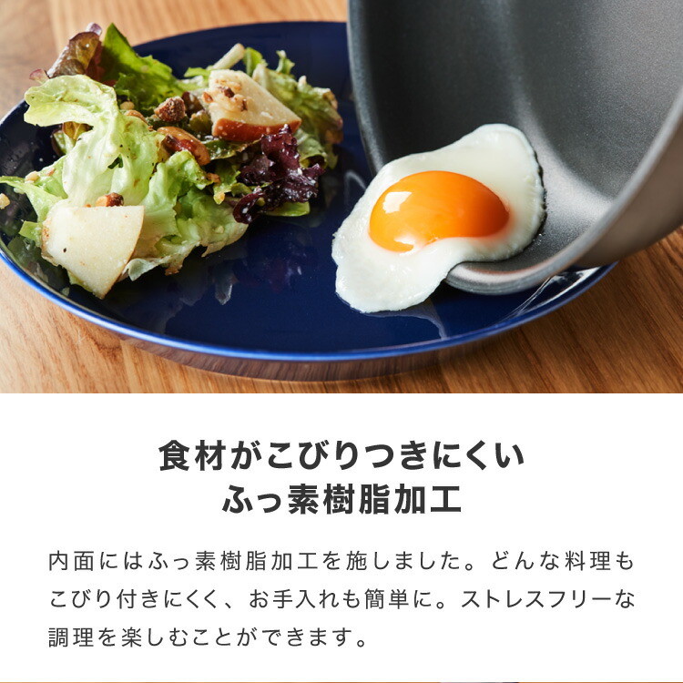 内面ふっ素樹脂加工を施し、どんな料理もこびりつきにくくお手入れ簡単。
