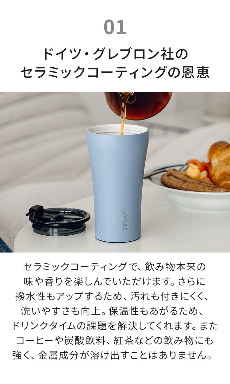 セラミックコーティングを施したステンレス構造により、飲み物本来の味わいを保ちながら優れた保温・保冷力を実現。