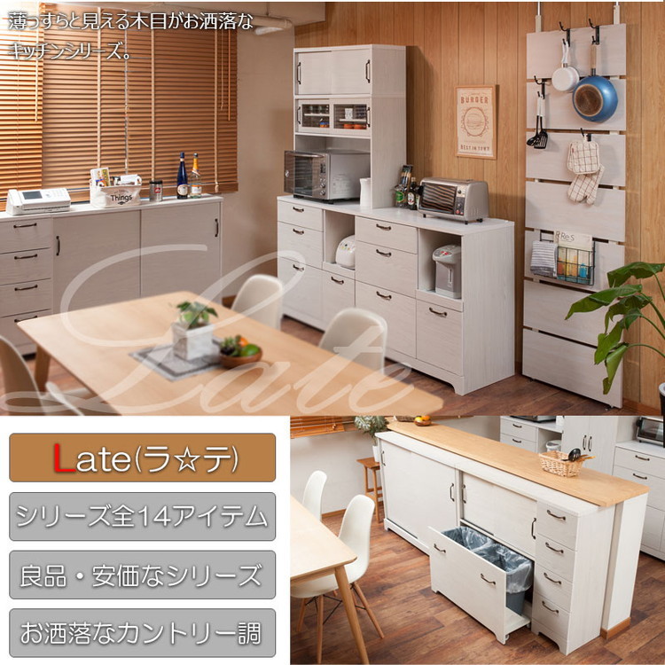 ゴミ箱が入っているとは思えないダストカウンターは大好評!家電や食器収納に最適なキッチンボードもラインナップ。『Late』シリーズは、やさしい木目で一人暮らし、二人暮らしにも使いやすいサイズ感がうけています。
