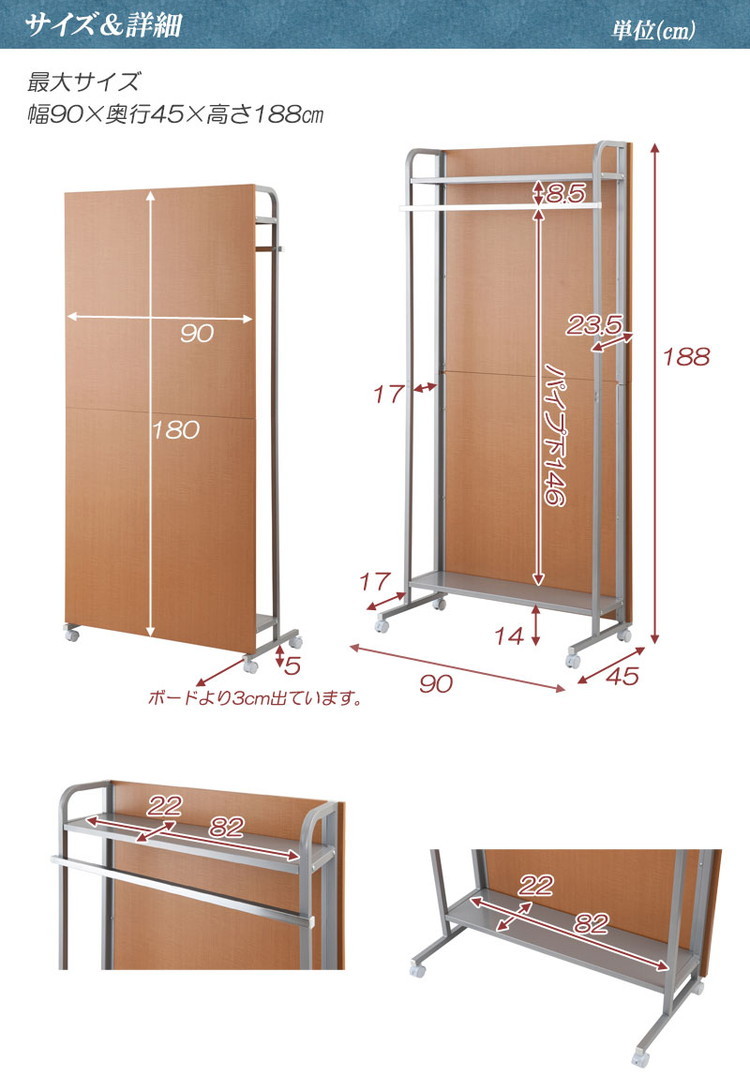 目隠し部分は清潔感際立つホワイト色、木目の温かみの落着きあるナチュラル色、モダンな印象のダークブラウン。キャスター付きでサッと移動ができて、奥行も薄型で圧迫感がありません。