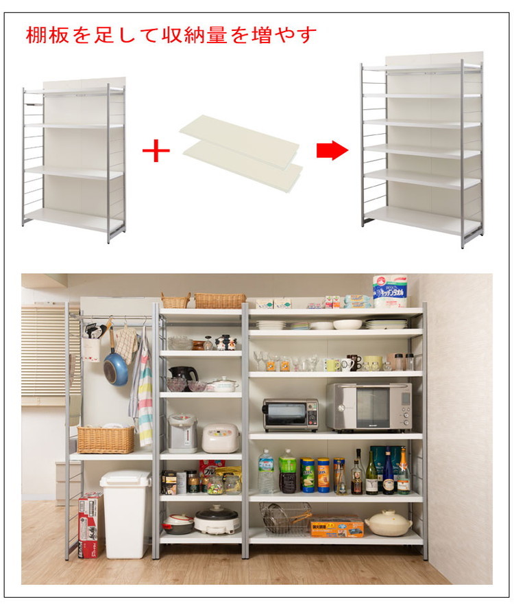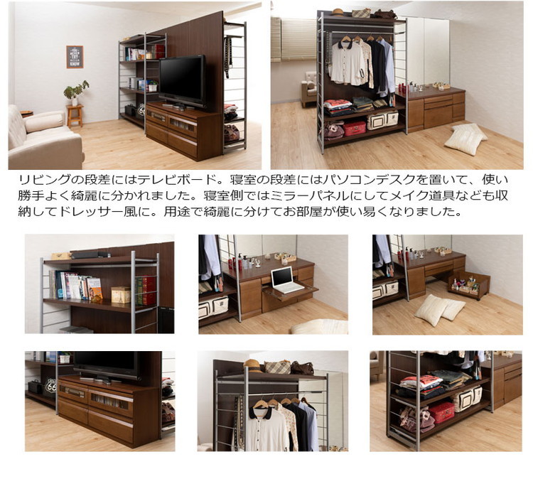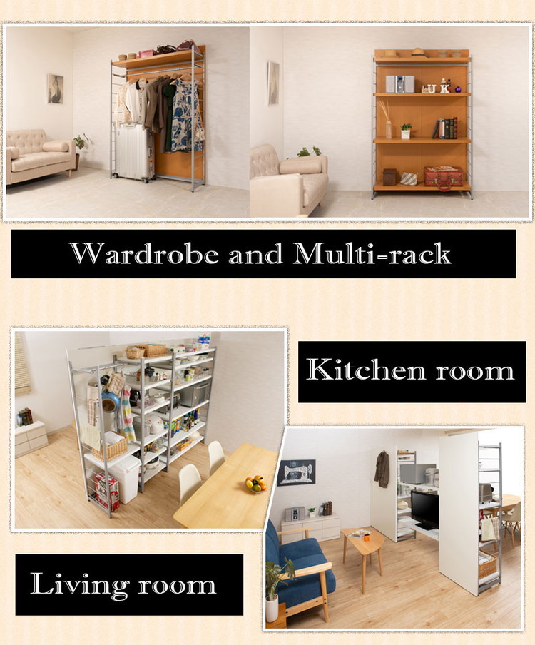 収納面はハンガーラックと4段棚の2タイプに、間仕切り面はボードと全身ミラーの2タイプをご用意。オフィスでの使用はもちろん、ご家庭でも間仕切りプラス収納で使い勝手のよいパーテーションです。