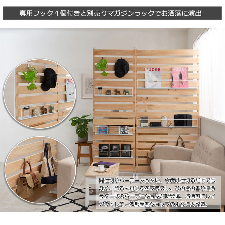 更に付属のフックで機能も充実。別売りマガジンパーツでさらに収納力が広がります。デザイン・機能・ディスプレイと3拍子揃った、ひのきキャスター付き間仕切りパーテーションを是非体感してください。
