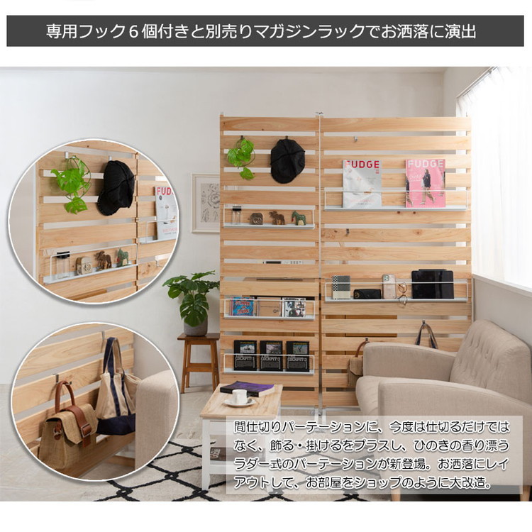更に付属のフックで機能も充実。別売りマガジンパーツでさらに収納力が広がります。デザイン・機能・ディスプレイと3拍子揃った、ひのきキャスター付き間仕切りパーテーションを是非体感してください。