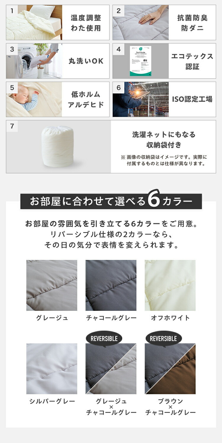 抗菌・防臭・防ダニ加工、丸洗いOKでいつでも清潔にご使用いただけます。