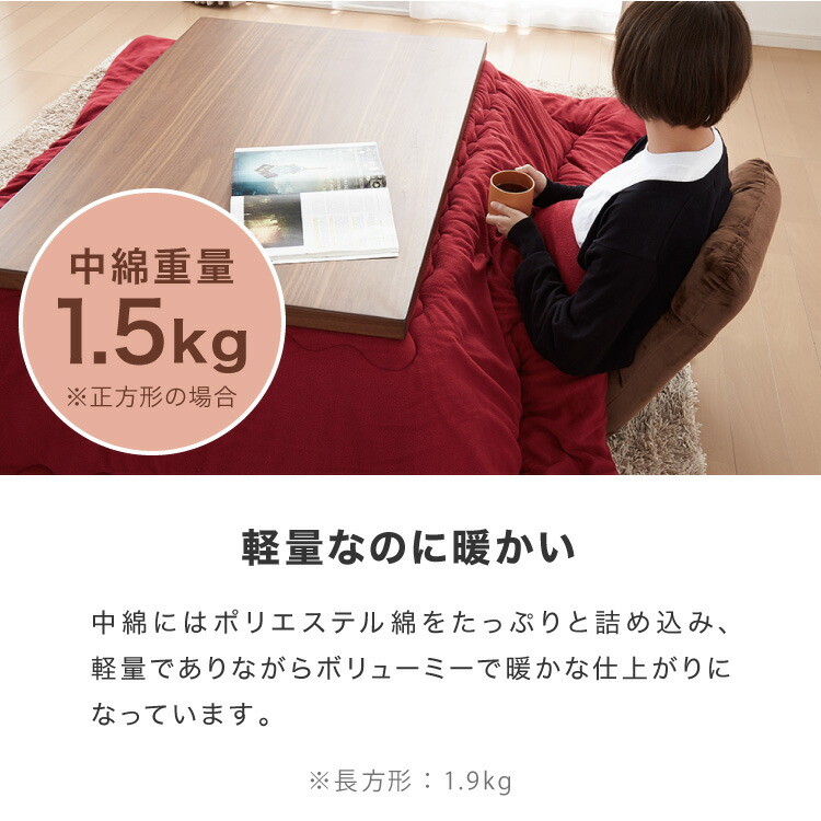 | 重量 | ・こたつ掛布団 正方形:2.4kg 長方形:3.1kg ・こたつラグ 正方形:1.5kg 長方形:1.9kg |