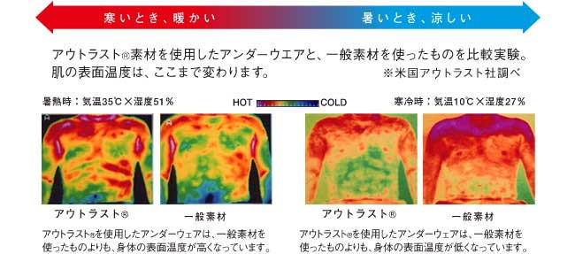 アウトラストとは、人間が一番快適だと感じる肌の表面温度(31℃~33℃)へ肌の表面温度をコントロールする温度調整機能素材です。