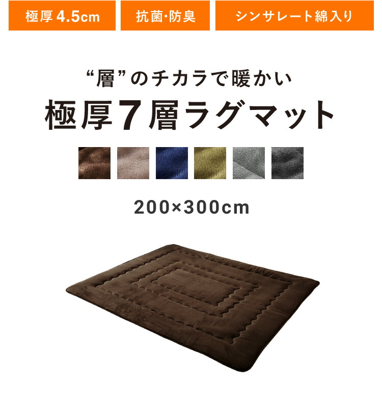 シンサレート使用 あったか極厚7層ラグマット 200×300 約4.5cm厚 ネイビー