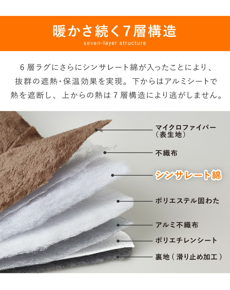中材:シンサレートシート、アルミ不織布、ポリエステルわた、固わた、ポリエチレンシート