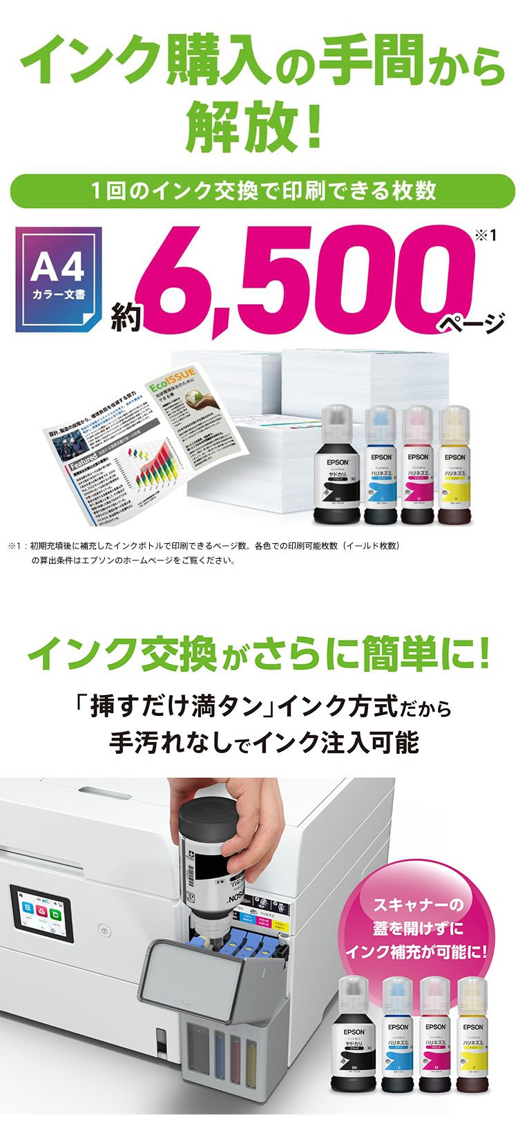 1ページあたり印刷コストA4モノクロ文書約0.4円(税込)、A4カラー文書約1.0円(税込)低印刷コストを実現。インクボトルの追加購入で1回交換すればA4カラー文書を約6、500ページプリントが可能。