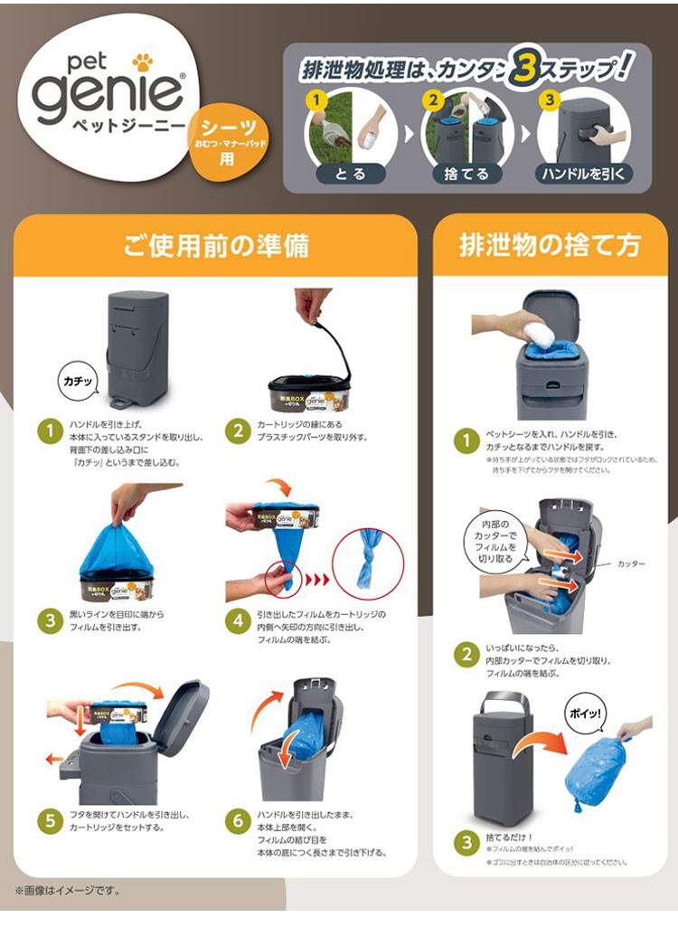 「ペットジーニー」は、ペット用シーツやおむつ、マナーパッドを清潔に処理できる防臭ダストBOXです。