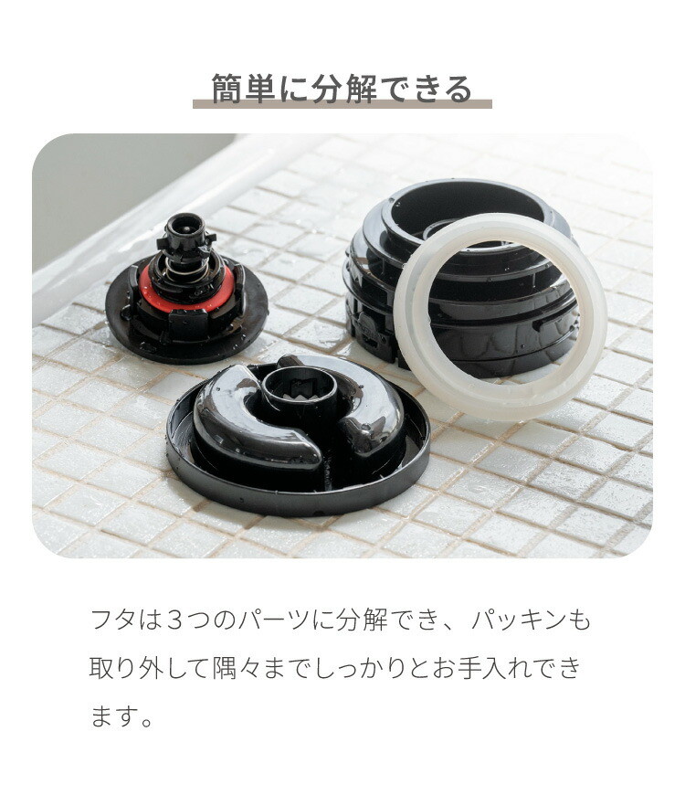 フタの内側まで洗いたいというご要望にお応えし、フタを簡単に分解できて洗いやすい構造に改良しました。フタ両側面を二本の指で挟んで軽く押すと、上下に外れてフタの隅々まで洗浄できます。また、ポット本体内にも手を入れてしっかりと洗うことができます