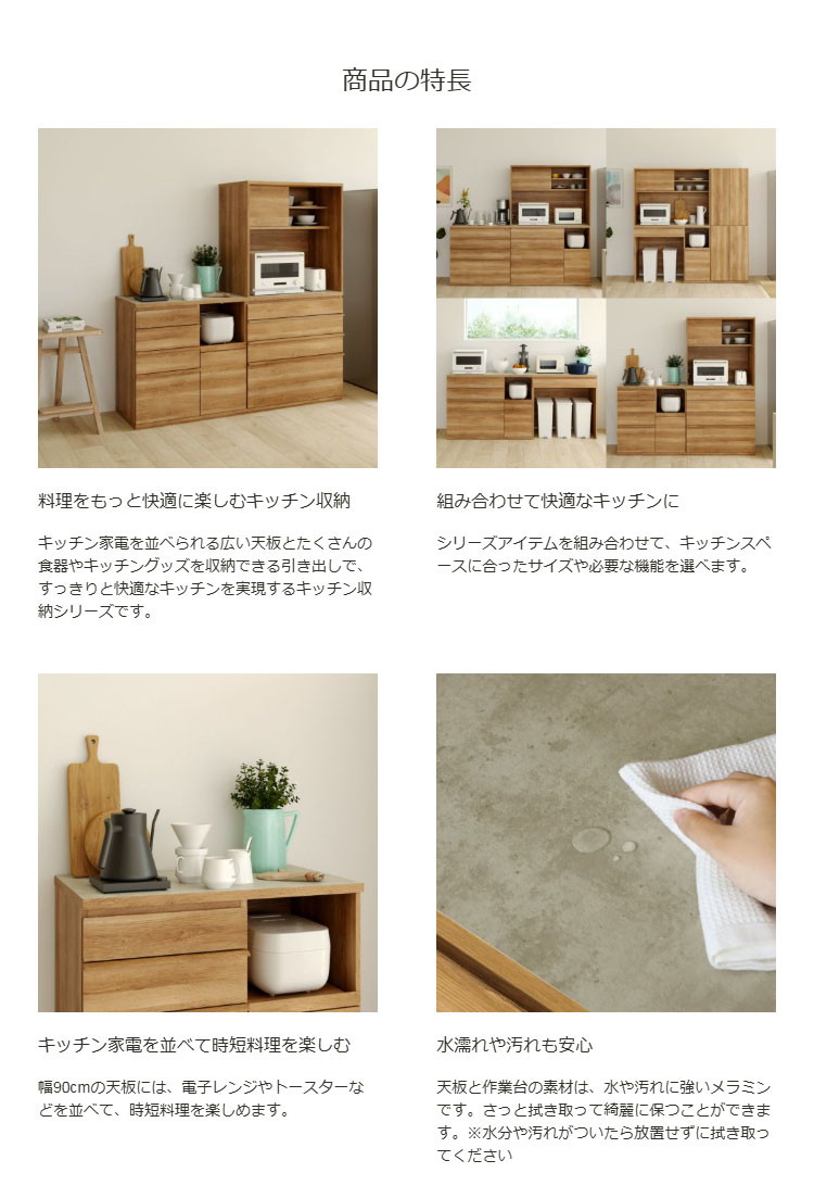 キッチンカウンター レンジ台 食器棚 幅90cm 高さ90cm ナチュラルブラウン 引出4段 コンセント付