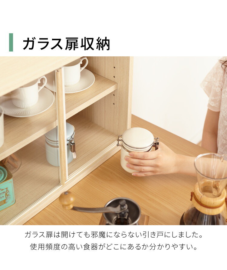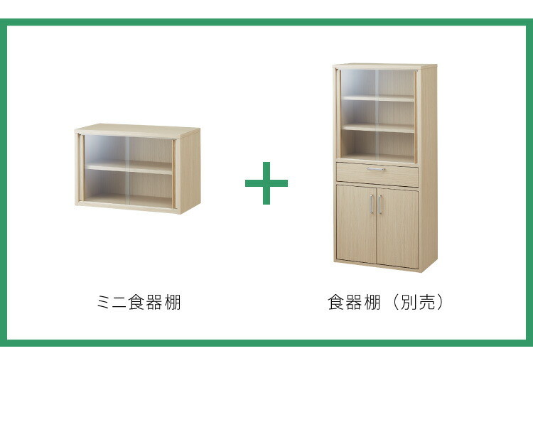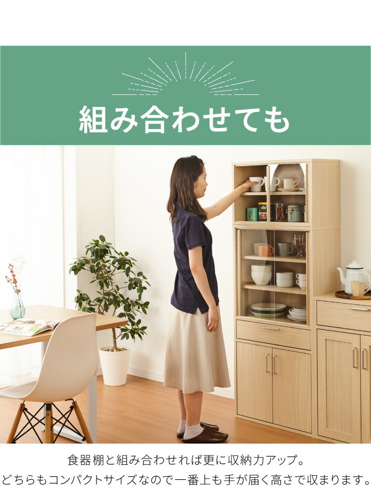 単品でも重ねても使えるガラス引き戸のミニ食器棚。同シリーズFUL-1255DGHNAまたはFUL8055DHNAの上に重ねて食器棚として、またはテーブルの上で調味料入れなどとしてご利用できます。
