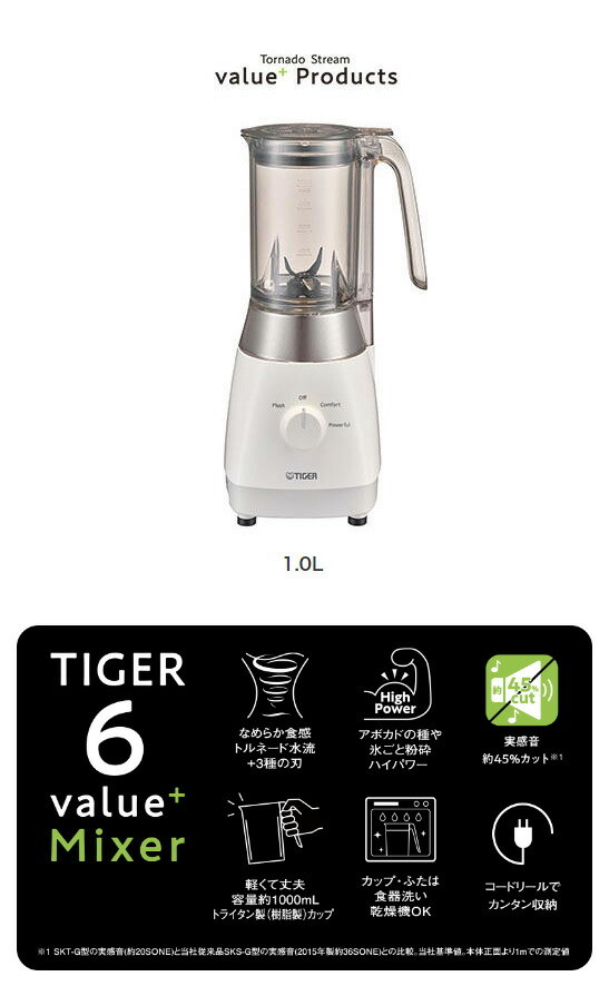 タイガー魔法瓶 ミキサー 1000ml ホワイト SKT-G100WS 食洗機可 軽量カップ 静音設計 静か コードリール スープ スムージー 1L urban life series タイガー TIGER