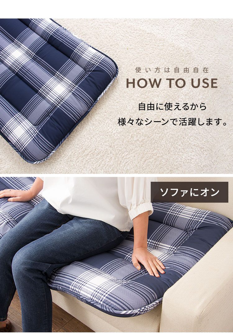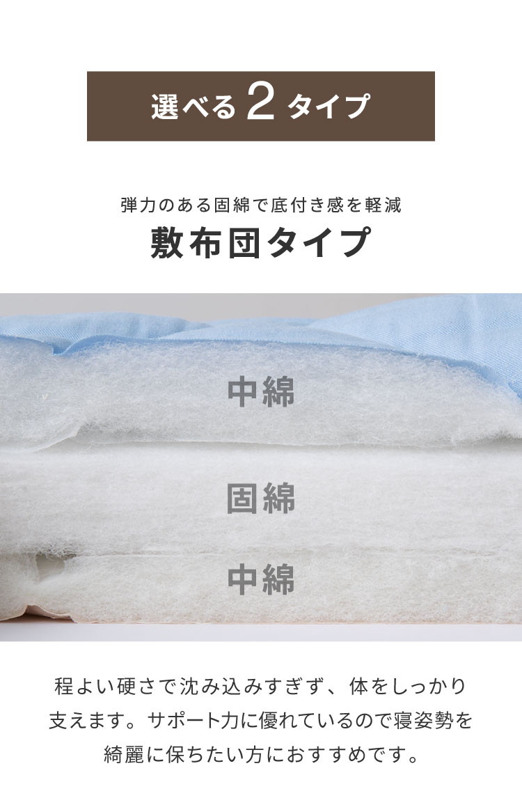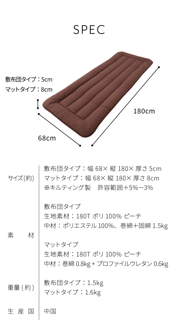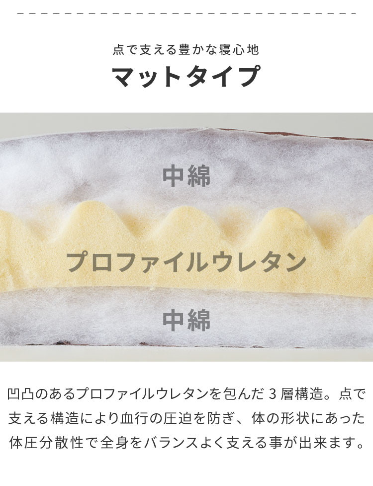 | 原材料/素材/材質 | 敷布団タイプ 生地:ポリエステル100% 中材:巻綿+固綿 ポリエステル100%(帝人マイティトップII入) マットタイプ 生地素材:ポリエステル100% 中材:巻綿 ポリエステル100%(帝人マイティトップII入)+ プロファイルウレタン |