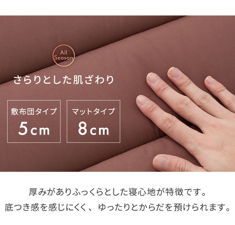 | 内容量 | 敷布団タイプ:1.5kg マットタイプ:巻綿0.8kg、プロファイルウレタン0.6kg |