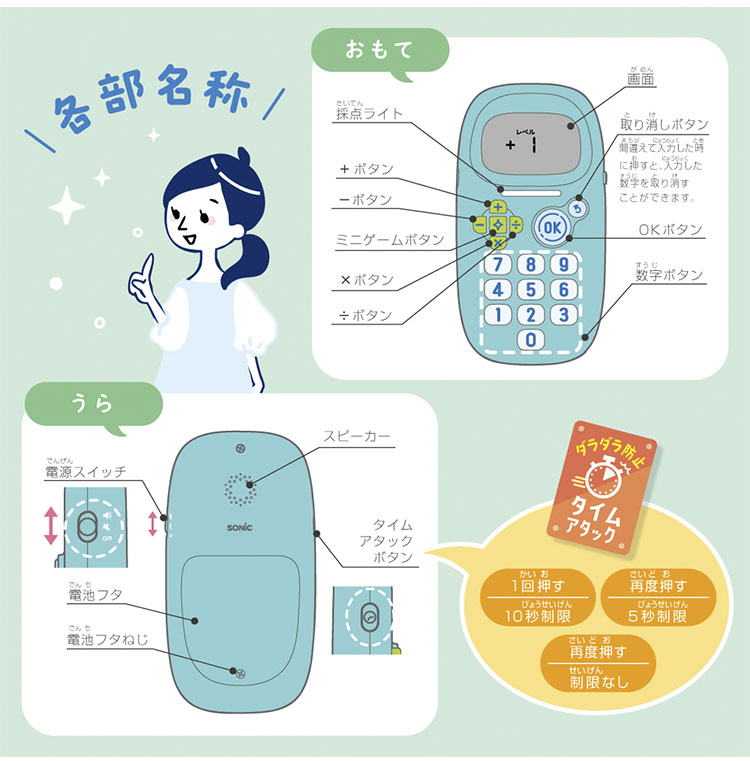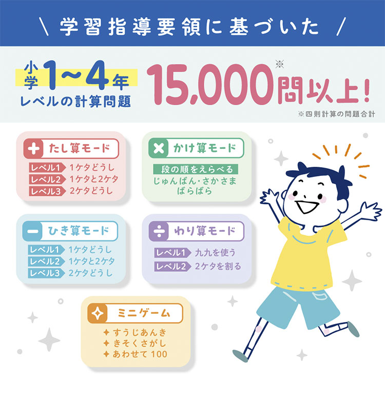 学習指導要領に基づいた小学1~4年レベルの四則計算問題15000問以上と、3種の数字ミニゲームを収録。ゲーム感覚でチャレンジ!