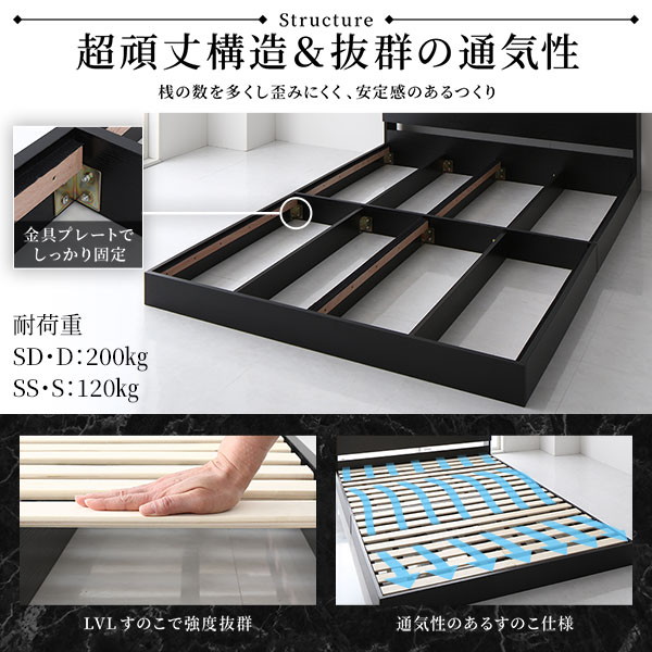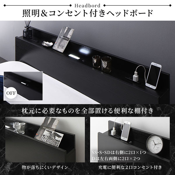 ベッド セミシングル 国産ポケットコイルマットレス付き ホワイト 低床 照明 棚付 宮付