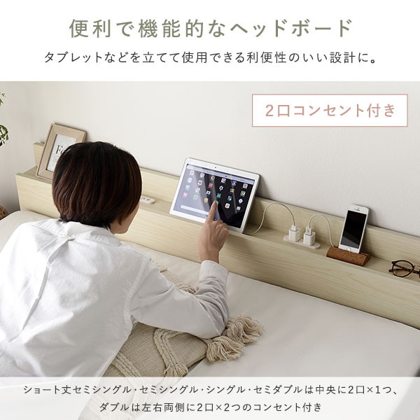 2口コンセント(1500W)付き(ショート丈セミシングル・セミシングル・シングル・セミダブルは中央に1つ、ダブルは左右両側に各1つ(計2つ))