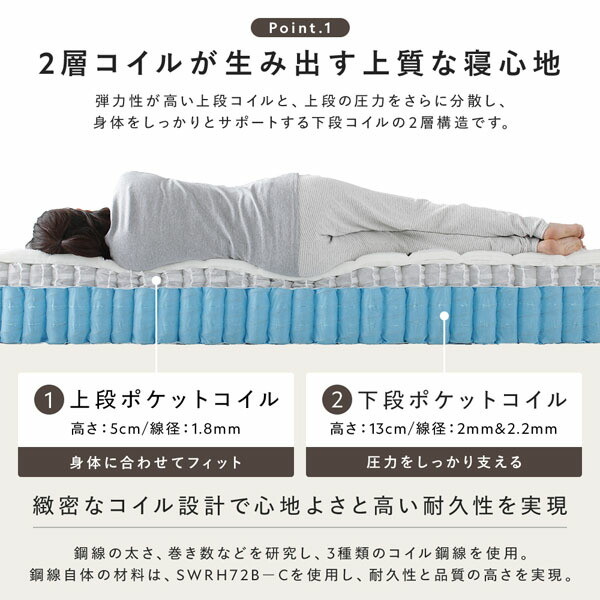 ベッド シングル 2層ポケットコイルマットレス付き ナチュラル 宮付き コンセント付き 天然木